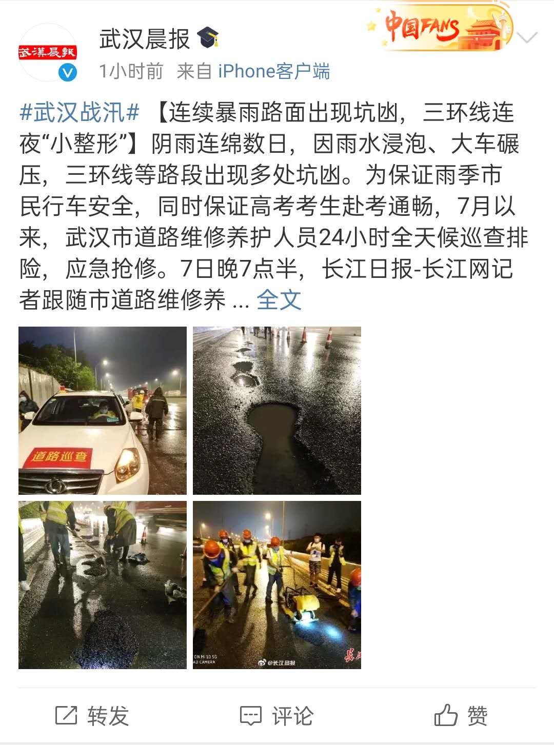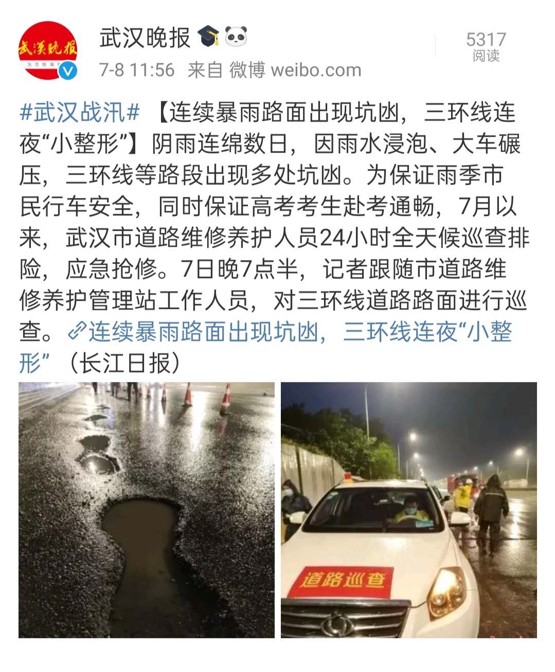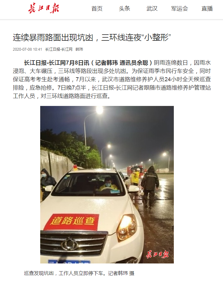 ? ? ? 近日,武漢市陰雨連綿,許多路段因雨水浸泡、車輛碾壓等出現(xiàn)坑凼,嚴(yán)重影響了交通安全。為保障雨季市民行車安全,助力高考考生赴考通暢,7月以來,漢陽市政六公司24小時(shí)全天候巡查排險(xiǎn),提前預(yù)防、提前搶修,積極修復(fù)受損路段,做到應(yīng)急搶修不斷檔,獲得了民眾的一致好評(píng),并被《長(zhǎng)江日?qǐng)?bào)》《武漢晨報(bào)》《武漢晚報(bào)》《楚天都市報(bào)》等主流媒體報(bào)道。