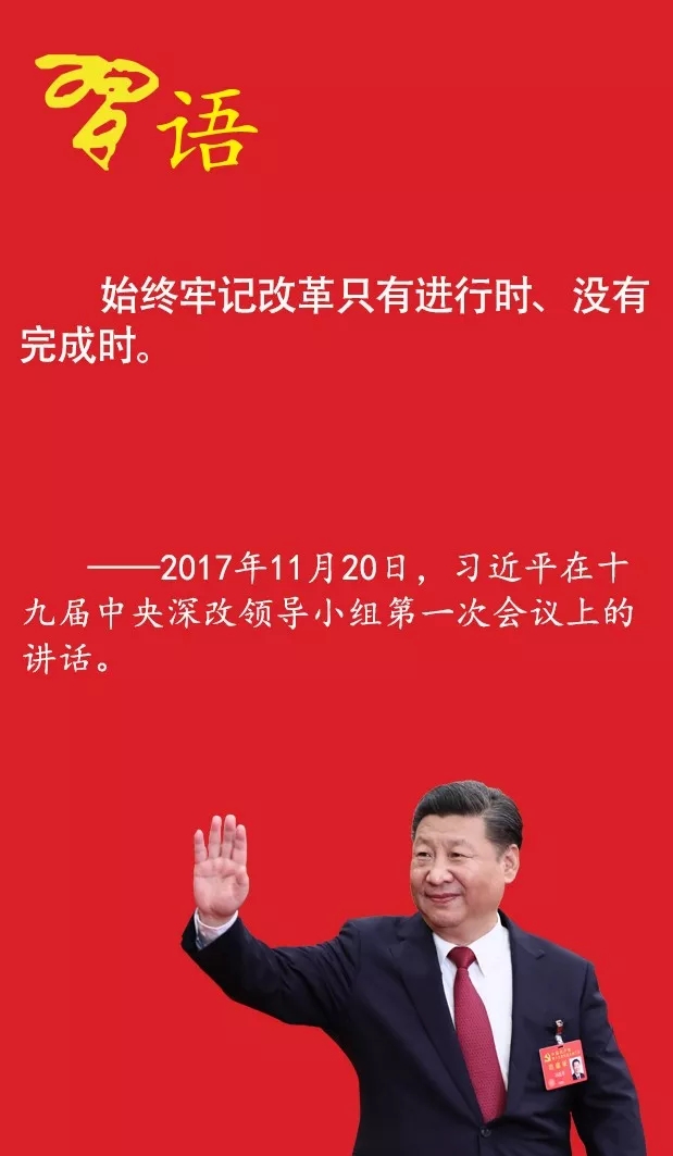 ——這是習(xí)近平總書(shū)記在十九屆中央深改領(lǐng)導(dǎo)小組第一次會(huì)議上的講話。此前,“改革只有進(jìn)行時(shí)、沒(méi)有完成時(shí)”的論述已廣為人知,但此次加上“始終牢記”4個(gè)字,進(jìn)一步彰顯出黨的十九大繼續(xù)推進(jìn)全面深化改革的堅(jiān)定決心。